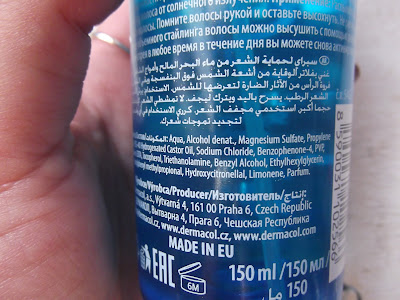 Ďalším kúskom je Beach style hair spray. UV ochranný sprej na vlasy s morskou soľou dodá vašim vlasom efekt ležérnych plážových vĺn. Obsahuje epsomskú soľ, ktorá má hygroskopické vlastnosti, vďaka čomu udržuje mokrý vzhľad vlasov a prirodzené vlny. Vďaka UVA/UVB filtrom chráni vlasové vlákno pred slnečným žiarením. Tento sprej je pre mňa taký, no, nemastný neslaný. Sprej v peknom plastovom obale s pumpičkou na dávkovanie. Má sladšiu peknú vôňu, ktorá pekne prevonia vlasy. Tak ľahko a ostanú svieže. Jeho úlohou je vytvoriť efekt akýchsi plážových vĺn. Môžete ho použiť na suché i mokré vlasy, nastriekate ho na ne, upravíte a vyfúkate. Vlasy ostanú akoby zlepené a hoci vyzerajú ako také mokré vlnky, tento efekt ma nijako nenadchol. Objem nemám, ak použijem len sprej a ak mám tužidlo, nepotrebujem tento sprej. Mamina si ho občas ráno ukradne a nastrieka do suchých vlasov, rozcuchá a ide do práce, ale mne veľmi nevyhovuje. Navyše, vlásky sú suchšie, takže to pre mňa nie je vôbec. Sprej stojí 5,69 eur. Pre mňa toto nie je produkt na leto ani na iné obdobie, nenašla som v ňom svojho obľúbenca.